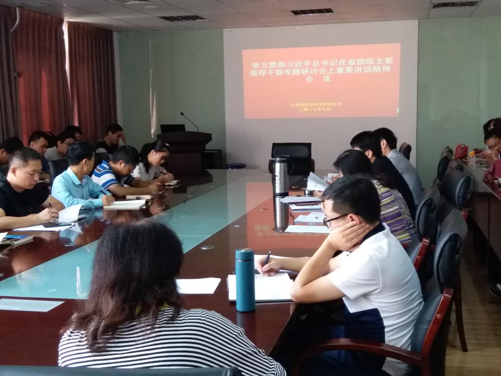 9月12日下午,公司党总支按照《中共太阳成tyc122cc集团委员会关于深入学习贯彻习近平总书记在省部级主要领导干部专题研讨班上重要讲话精神的通知》要求,在五楼会议室召开总支扩大会议组织全体教工学习,生命科学技术公司、生物技术研究所、能源研究所全体教师参加此次了会议。会议由党总支书记田涛主持。
