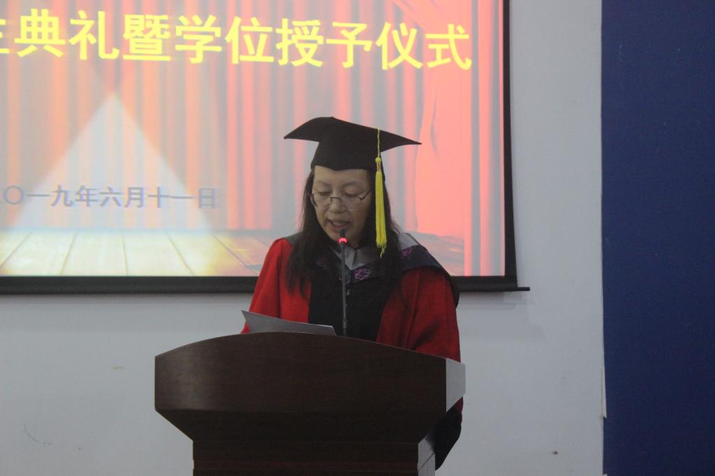 紧接着任敏经理致辞,用热情洋溢、激情澎湃的话语表达了对毕业生的祝愿与美好期待。毕业生代表王佳玫同学和在校生代表吴梦瑶同学依次发言,分别表达了对恩师的感激、对美好未来的憧憬以及对毕业生的祝愿。最后,2019届毕业生分组有序走上典礼台,相关领导及学位评定委员会老师为他们拨穗正冠、颁发学位证书并合影留念。