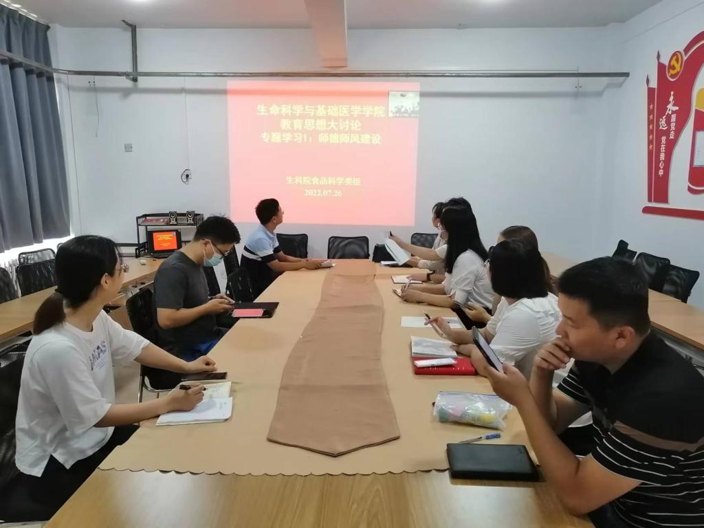 为扎实推进教育思想大讨论工作,按照《生命科学与基础医学公司教育思想大讨论工作实施方案》部署,7月26日下午,生命科学与基础医学公司食品科学类学习小组在公司三楼会议室开展师德师风建设专题学习。
