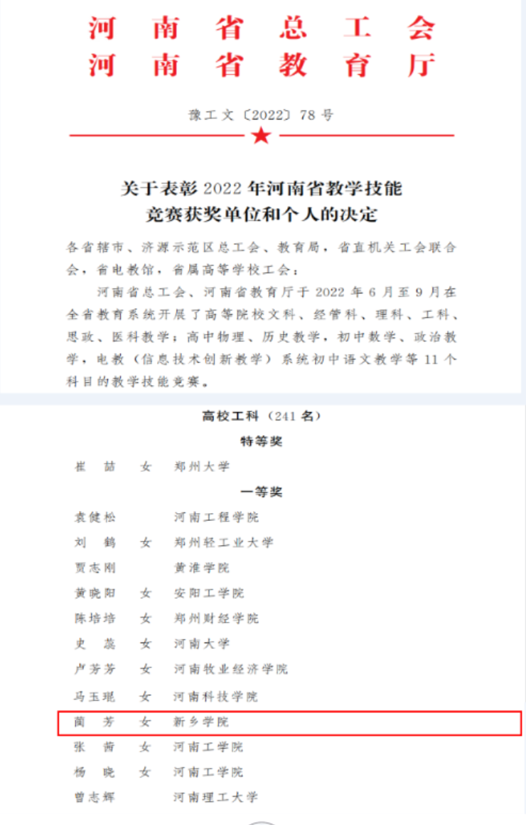 近日,从河南省总工会、河南省教育厅联合下发的《关于表彰2022年河南省教学技能竞赛获奖单位和个人的决定》(豫工文〔2022〕78号)中获悉,公司蔺芳老师获得此次大赛一等奖,并被授予“河南省教学标兵”称号。