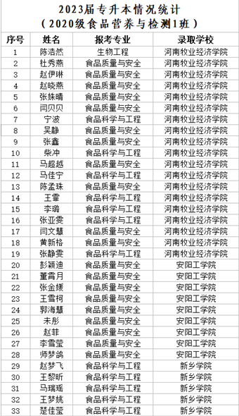2023届公司有一个专科毕业班,专业为食品营养与检测,共有58名员工,报名参加专升本考试的同学有56名,报考率高达96.5%;其中49名员工顺利上岸,报录比达到87.5%,录取比例高。考试总体成绩优异,其中有2名同学考出了233分的高分,名列全省专业第一。此外,19位同学考上了河南牧业经济公司,9位同学考上了安阳工公司,还有多名同学考上了太阳成tyc122cc集团、信阳农林公司等院校。