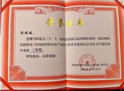 大会还举行了征文活动,在河南省特色农产品加工技术交流论坛会议论文评选活动中,郭瑞瑞的参赛论文在同行中脱颖而出,获得三等奖,这也是公司首次在省级同行单位中荣获该奖项,标志着公司在科研水平和学术影响力上迈上了新的台阶。此外,参会教师与众多食品科学领域专家学者进行了深入交流和讨论,促进学术思想的碰撞与融合,获知农产品加工的新发展趋势和需求,进一步提升自己的学术水平,增强科研信心。通过本次的交流学习,拓宽了教师学术视野、建立了学术网络、为公司的团队建设和科研发展创造提供了新的思路。