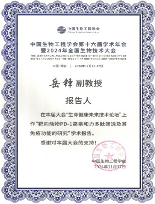 大会以“创新与跨越,构建生物经济新格局”为主题,探讨生物工程领域的最新进展、面临的挑战以及未来的发展趋势,促进生物工程领域交流与合作,推动生物技术的突破性创新,加速生物经济时代的到来,为全球经济的可持续发展注入新的活力。公司岳锋博士在大会分论坛作了题为“靶向动物PD-1高亲和力多肽筛选及其免疫功能的研究”,和与会专家就动物新型疫苗和生物制品研发进行了深入的交流和探讨。
