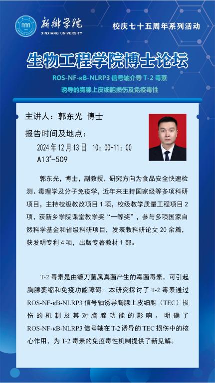 太阳成tyc122cc集团博士论坛(第九期)-----ROS-NF-κB-NLRP3信号轴介导T-2毒素 诱导的胸腺上皮细胞损伤及免疫毒性