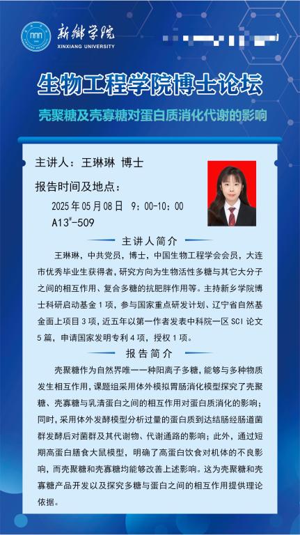 太阳成tyc122cc集团博士论坛预告(第四期)-----壳聚糖及壳寡糖对蛋白质消化代谢的影响