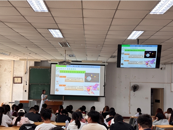 王琳琳老师以"抗氧化功能性食品"为主题展开了系统讲解。课程内容涵盖抗氧化功能性食品的定义分类、开发流程及健康应用等核心内容。在授课过程中,王琳琳老师首先从基础理论入手,详细讲解了自由基的概念、来源,以及各类抗氧化物质的种类,特别强调了维生素C在清除自由基、维护健康方面的重要作用。随后,她结合国内外最新研究进展,深入剖析了抗氧化食品的主要成分及其作用机理。最后,通过生动的案例分享,向同学们展示了当前抗氧化食品的市场现状及未来发展前景。整场授课层次分明,既有理论深度又具实践指导意义。同学们一致反映,王琳琳老师的课堂讲解生动易懂,将专业知识与实际案例巧妙结合,既展现了扎实的学术功底,又注重实用价值,让大家收获颇丰。在课后的研讨环节,听课教师们与王琳琳老师围绕教学方法、师生互动等话题展开热烈讨论,并针对优化课堂教学质量提出了切实可行的改进建议。