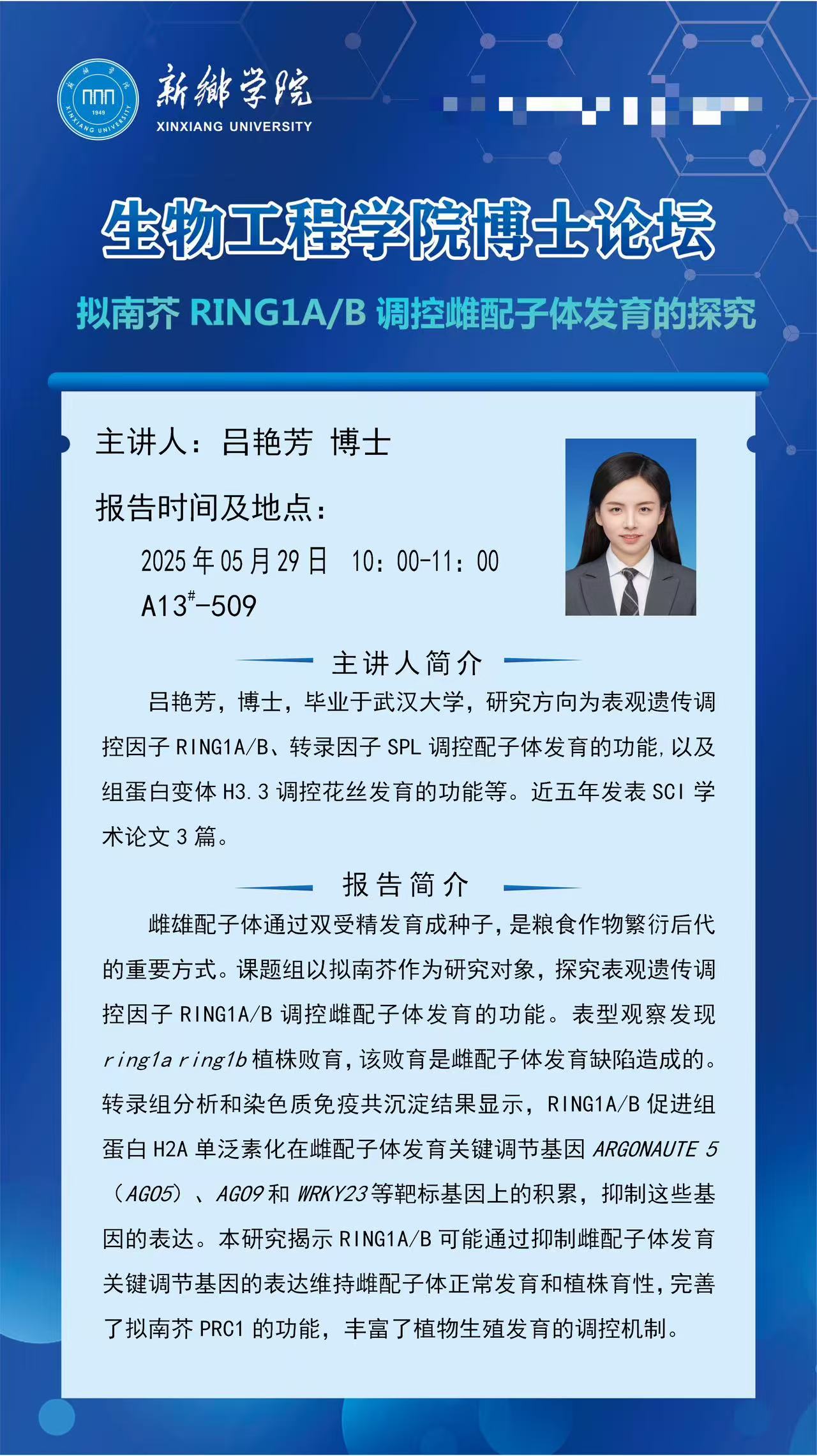 太阳成tyc122cc集团博士论坛预告(第八期)-----拟南芥RING1A/B调控雌配子体发育的探究