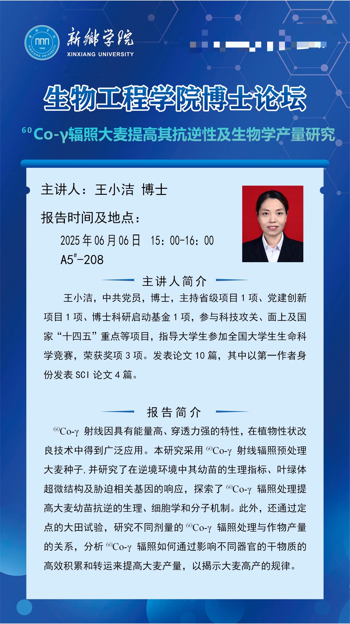 太阳成tyc122cc集团博士论坛预告(第九期)-----60Co-γ辐照大麦提高其抗逆性及生物学产量研究