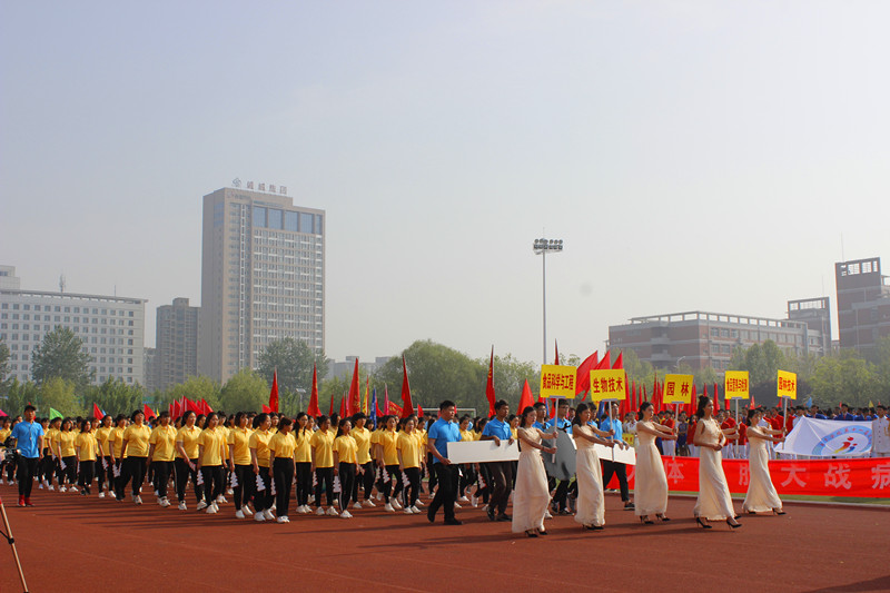 在运动场上,伴随着音乐的响起,国旗方阵、会旗方阵、红旗方阵、裁判员方阵以及各院系的代表队依次入场。公司运动方阵由160人组成,他们迈着整齐的步伐,昂首阔步的向主席台走来。“生命不息,运动不止;生科出击,谁与匹敌”是他们的口号,彰显着他们昂扬向上的气势。在主席台前,他们变换队形,整齐有序,手中挥动着的变色扇子更是吸引了在场观众。方阵通过变换生动地展现了人体细胞大战病毒的过程更是彰显公司的特色。他们在开幕式的现场留下了一道靓丽的风采。