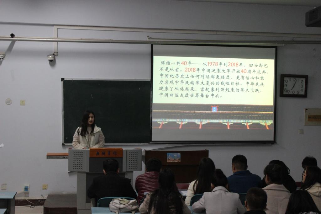 比赛伊始,主持人介绍比赛规则和评分标准。参赛选手用声情并茂的演讲展示了改革开放40年以来,国家在各个领域所取得的丰硕成果。选手们的演讲时而慷慨激昂,时而舒缓动情,博得现场观众的阵阵掌声。参赛选手演讲主题鲜明、从社会变迁及自身生活等方面描述改革开放所带来的巨大变化。评委从演讲内容、语言表达、主题阐明等几个方面对参赛选手进行评分。最后,主持人宣布比赛结果,沈欣烨荣获一等奖,杨琪琪荣获二等奖,李盼盼、王晶晶、李昕荣获三等奖。