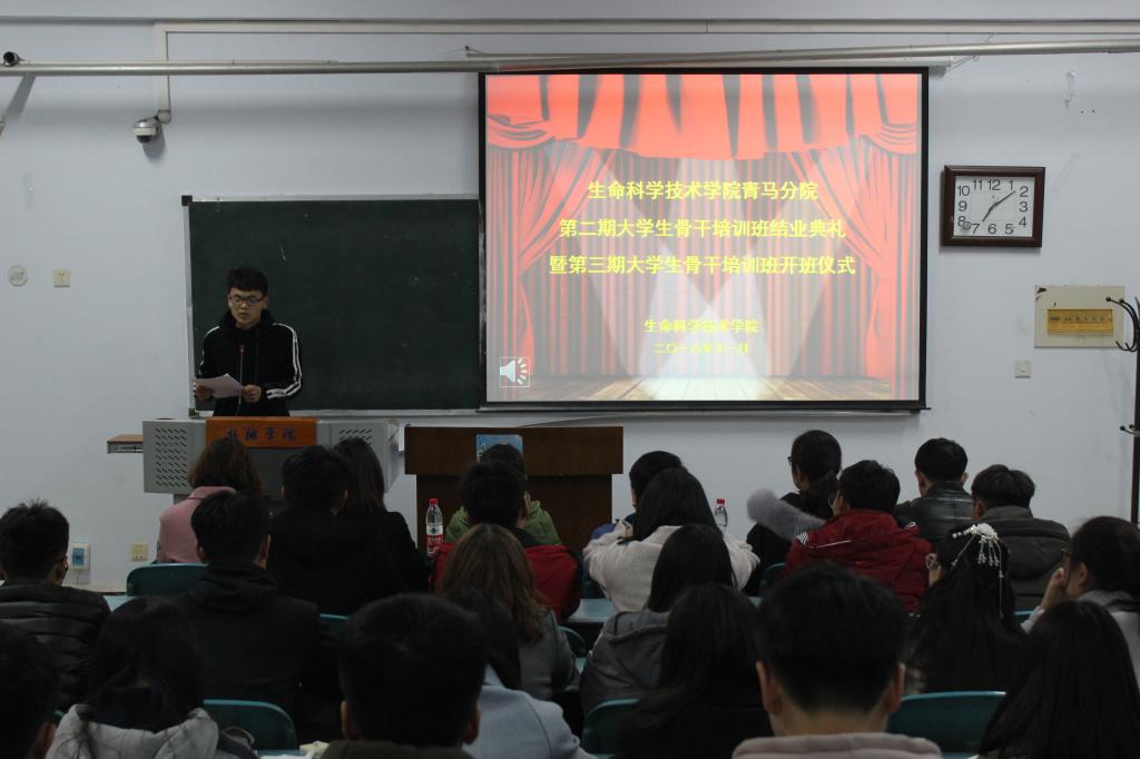 会议伊始,由主持人刘安南介绍到场的领导老师。随后,第二期青马班学员代表孙文倩发言,主要讲解了对青马班认识和在青马班学习的感悟,同时表达了对新学员的祝贺与期待。紧接着,牛姣姣老师给第二期学员颁发结业证书。然后,吴亚旗老师宣读《生命科学技术公司青年马克思主义培养公司培养方案》。接着由第三期青马班学员代表陈桐玉同学发言,表达了对青马班学习的期待。接下来,党总支书记田涛老师做总结性讲话,首先对培训班的顺利开班表示热烈的祝贺,他指出实施青年马克思主义者培养工程是党交付给共青团的一项重要政治任务,是确保党的事业兴旺发达、后继有人的一项政治工程,我们公司把实施“青马工程”作为一项重要战略任务长抓不懈。最后田书记从提高思想认识、勤奋刻苦学习、争当先锋模范三个方面提出对同学们的要求,希望同学们志存高远,胸怀理想,做马克思主义的坚定拥护者、实践者和引领者,并预祝第三期老员工骨干培训班圆满成功。最后,团总支委员刘安南宣布大会结束。