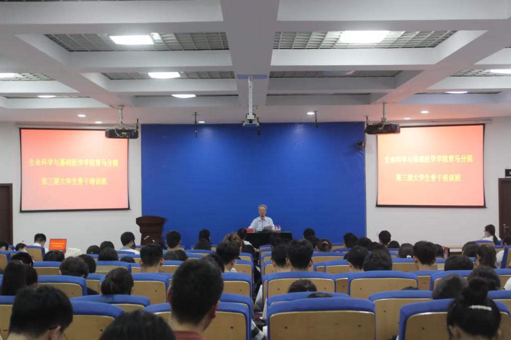为了深入学习宣传贯彻党的二十大精神,推动学习贯彻习近平新时代中国特色社会主义思想走深走实,进一步激励青年员工勇担使命,踔厉奋发,生命科学与基础医学公司于6月1日19:30在A05报告厅成功开展社会主义核心价值观大讲堂主题讲座活动,此次讲座的主题是“老少共话二十大,踔厉奋发新征程”。生命科学与基础医学公司党委副书记原玉丰,辅导员姚澜老师、卢韵宇老师、郭天琪老师出席此次活动,此次讲座邀请公司退休教师陈德勋老师担任主讲人,会议由贵晨光同学主持。