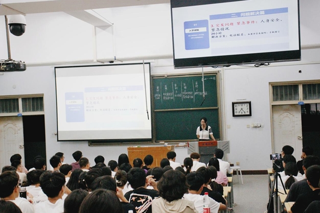 首先,李攀月根据公司相关规定,结合自身经历就如何快速适应老员工活给出建议,并就老员工活中的常见问题和困惑与同学们展开探讨。随后,李攀月阐明了高校设立资助项目工作的目的和意义,介绍了资助政策和绿色通道的概念以及军训注意事项。最后,强调有关预防校园诈骗的重要性。她指出,当前社会诈骗形式多样,需要不断提升安全防范意识,积累校园防诈知识,提高防诈能力,避免个人财物损失。