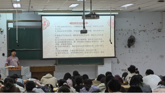 宋博首先向同学们表达了诚挚的节日问候,随即强调了快乐、安全度假的核心理念,并对同学们进行了系统、全面的讲解与安全提醒。一是人身安全是首位,注意食品卫生,谨记交通安全,防范隐患危险;二是财产安全要留心,不向陌生人转账会款,不随意点击不明链接,不透漏个人信息;三是身心安全不放纵,保持乐观心态,合理规划时间,谨记健康第一。最后,宋博再次强调:“安全是享受一切美好与快乐的前提。”希望每一位同学都能将安全知识内化于心,外化于行。祝愿各位同学度过一个快乐,美满的假期。
