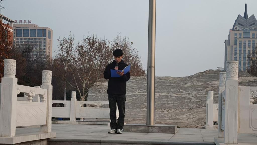清晨天蒙蒙亮,同学们有序入场,仪式正式拉开帷幕。本次仪式流程严谨、环环相扣,共分为六项。第一项,国旗护卫队出旗。国旗护卫队队员身姿挺拔、眼神坚定,步伐整齐划一、铿锵有力,全体同学肃立,目光紧紧追随,向国旗致以最崇高的敬意。第二项,升国旗,奏唱国歌。激昂雄壮的国歌奏响,五星红旗在晨风中缓缓升起,全体同学面向国旗,行注目礼。第三项,国旗下讲话。员工代表王盼盼以饱满的热情发表演讲。他号召同学们将个人的热爱与理想,紧密融入国家发展的宏伟大局之中;把青春的热血与激情,毫无保留地汇入时代的滚滚洪流,在实现中华民族伟大复兴的征程中书写属于自己的精彩篇章。第四项,第16届国旗护卫队代表赵子皓发言。他以“一二·九”运动为切入点,深刻阐述了爱国精神的内涵与意义。他呼吁大家,不能仅仅将爱国停留在口号层面,而要将其转化为日常生活中的实际行动。要以先辈们为榜样,勇挑时代赋予的使命,在各自的岗位上发光发热。第五项,全体宣誓。在主持人的带领下,全体同学举起右拳,庄严宣誓。铮铮誓言如洪钟般响彻校园上空,彰显着青年学子们勇担责任、奋发有为的坚定决心和使命担当。第六项,主持人宣布升旗仪式圆满结束。