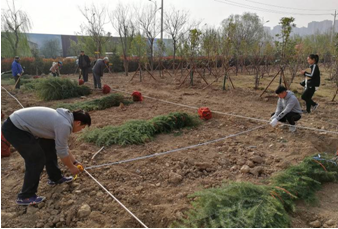 植树现场,同学们听从工作人员的安排和老师的指挥,有的帮助施工人员测量定位,有的拿着铁锹挖坑填土,有的帮忙扶树,有的拿着剪刀剪去捆绑树枝和土球的绳子。大家各尽所能,密切配合,整片区域充满了奋力劳作,积极实践的气氛。此次植树活动中,同学们在搬运树苗、定点放线、挖栽植穴、树木定植、固定支撑等各个环节都展现出良好的专业素养,能够熟练地把课堂上学习到的知识运用到实践,最终圆满地完成了此次植树活动。