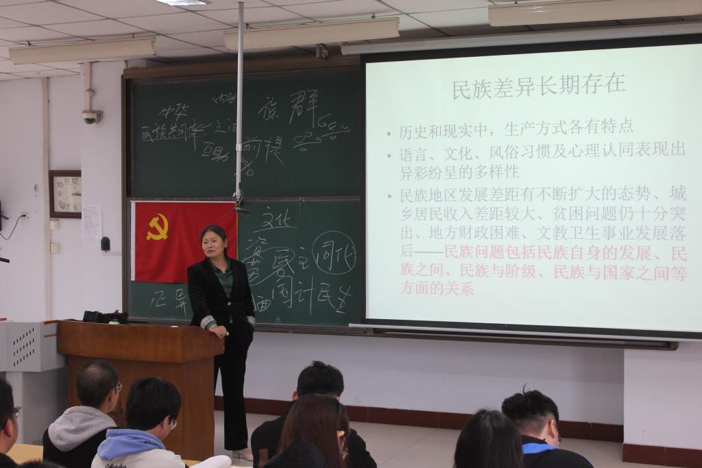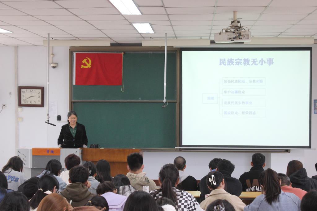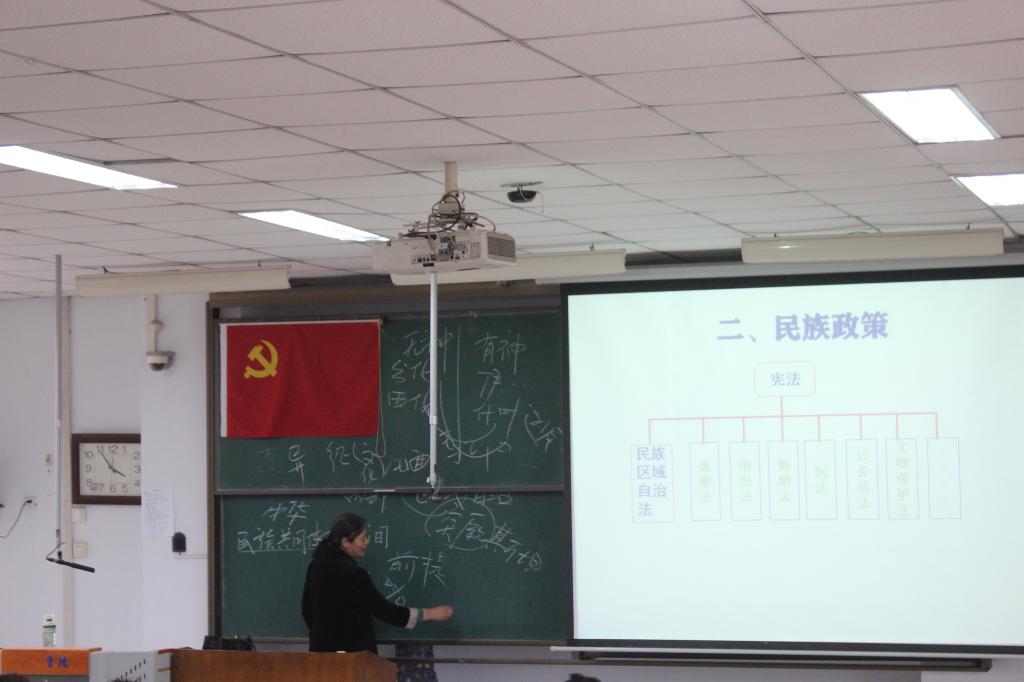 此次党课的主题为“中国特色社会主义民族宗教理论知识”。首先薛老师指出当前社会的主要矛盾为人民日益增长的美好生活需要和不平衡不充分的发展之间的矛盾,并以此为基点,诠释了民族与国家之间的关系。接着,薛老师从宗教与民族联系的方面阐述了中国特色社会主义民族宗教理论知识在处理民族关系方面的应用。随后,薛老师表示,民族关系、民族问题与国家发展密不可分。只有做到民族平等、民族团结、各民族共同繁荣才能实现中华民族的伟大复兴。